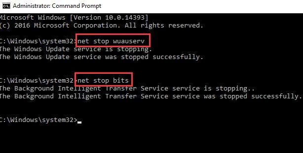 2) Введите чистая остановка wuauserv и ударил Войти. Подождите, пока процесс закончится. Затем введите стоповые биты и ударил Войти. Подождите, пока процесс закончится.