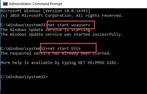 6) Введите чистый старт wuauserv и ударил Войти. Подождите, пока процесс закончится. Затем введите чистые стартовые биты и ударил Войти. Подождите, пока процесс закончится.