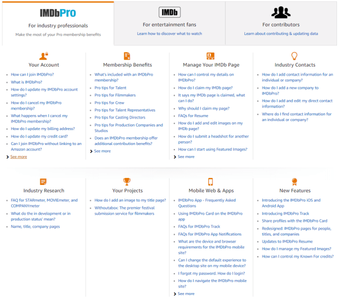 У IMDbPro есть и другие преимущества, которые больше связаны с исследованиями, поэтому речь идет не только об актерах и актерских играх. Есть также полные фильмографии, гораздо более подробная база данных людей, мест и их контактных данных, контактная информация компании и агента и ежедневные отраслевые новости от инсайдеров.
