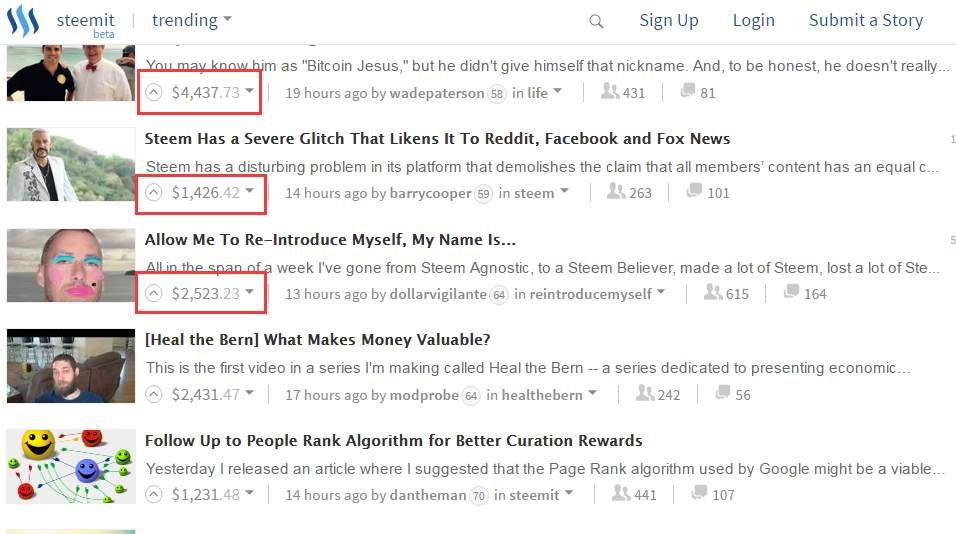 В основном, вы можете увидеть знак доллара под каждой темой, который показывает, сколько STEEM получает автор с этого поста.