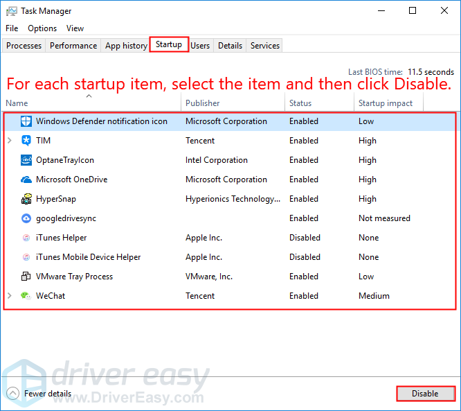 4) На Запускать вкладка в Диспетчер задач, за каждый элемент автозагрузки, выберите элемент, а затем нажмите инвалид.