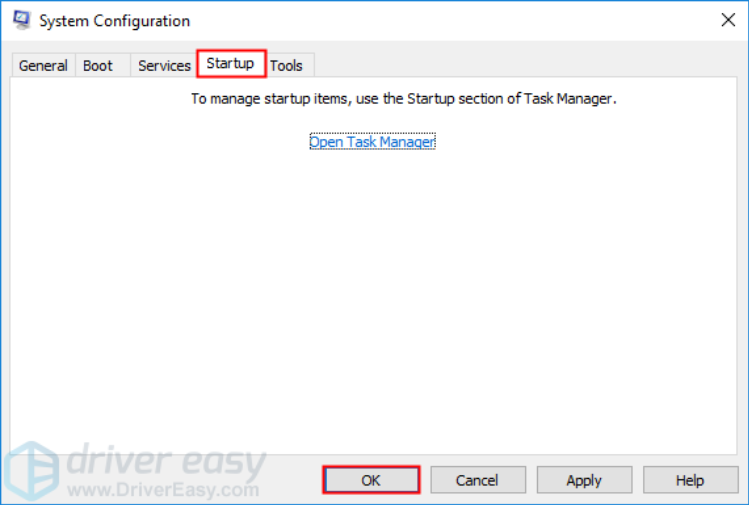 3) Выберите Запускать вкладка и нажмите Открыть диспетчер задач.