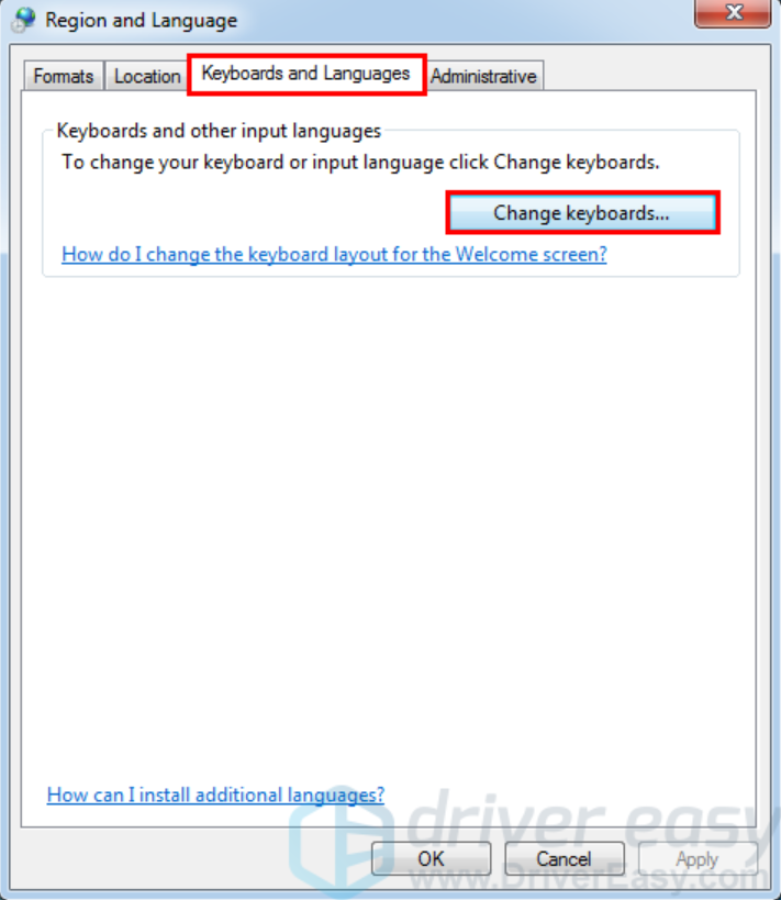 3) Во всплывающем окне выберите Клавиатуры и Языки вкладка и нажмите Сменить клавиатуру …