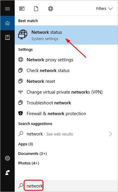 1) Тип сеть в поле поиска при запуске. Затем нажмите Состояние сети из результата.