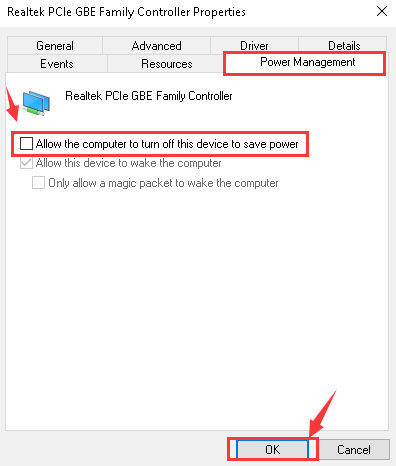 7) Тем не менее, в свойства окно, на этот раз, давайте перейдем к Управление энергопотреблением Вкладка. Снимите флажок для Разрешить компьютеру выключать это устройство для экономии энергии. Затем нажмите Хорошо сохранить и выйти.