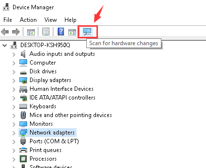 4) Перейдите в строку меню сверху и нажмите кнопку для Сканирование на предмет изменений оборудования.