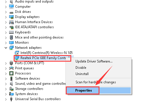 3) Затем щелкните правой кнопкой мыши Realtek PCIe GBE Семейный контроллер вариант и выбрал свойства.
