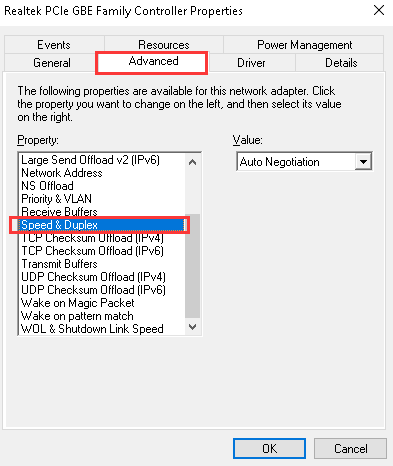 5) На Значение панель, измените автоматическое согласование по умолчанию на 100 Мбит / с полный дуплекс или некоторые другие варианты соответственно. Мы выбираем 100 Мбит / с полный дуплекс здесь, но ваш может быть другим.