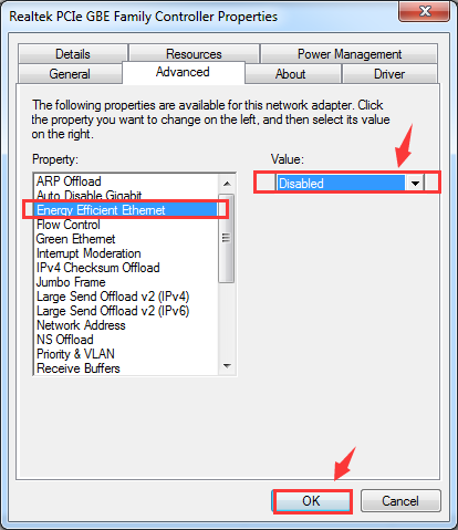 6) Теперь на левой стороне панели выберите Энергоэффективный Ethernet затем измените значение на инвалид. После изменений нажмите Хорошо сохранить.
