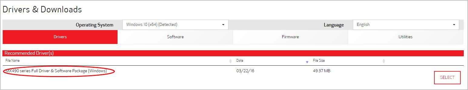 - Перейти к Центр загрузки Canon, найти драйвер для принтера Canon PIXMA MX492.