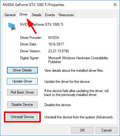 4) Нажмите на Водитель вкладку, затем нажмите Удалить устройство.