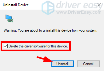 5) Проверьте Удалить программное обеспечение драйвера для этого устройства, затем нажмите Удалить.