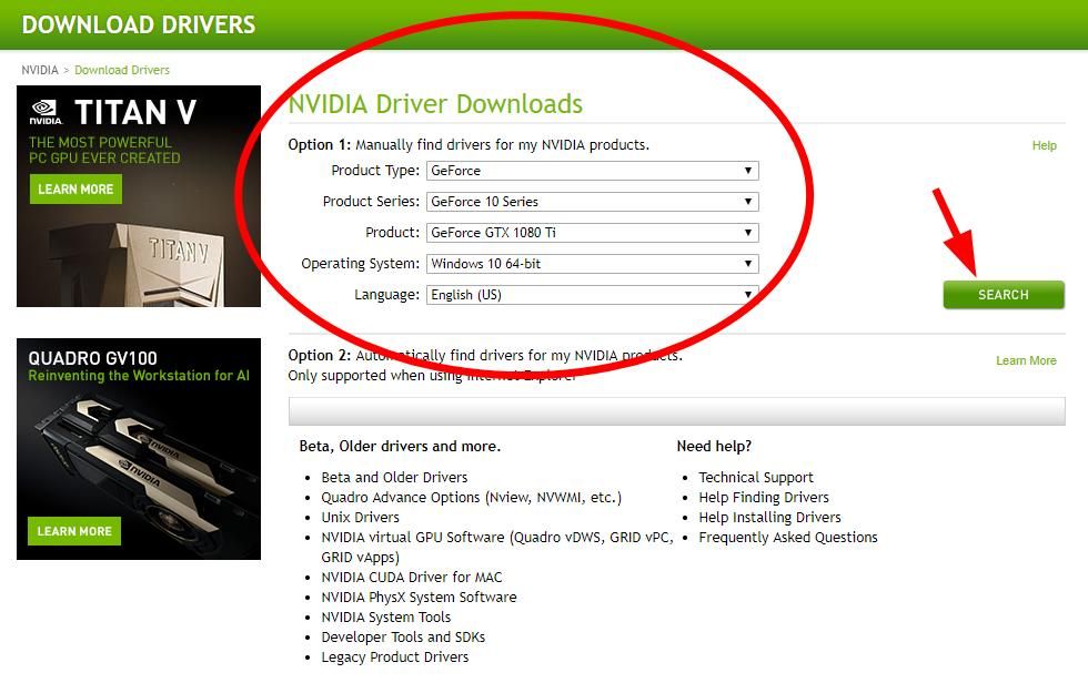 8) выберите GTX 1080 Ti и ваш операционная система. Затем нажмите Поиск.