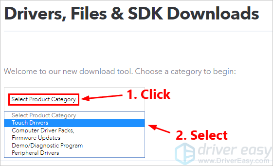 - Нажмите Выберите категорию продукта. Затем выберите Сенсорные драйверы.