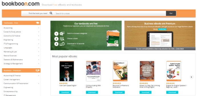 Bookboon.com — специалист по учебникам, который предлагает бесплатные книги для скачивания. Они зарабатывают деньги, взимая плату за учебники по бизнесу и рекламу, поэтому учебники бесплатны и, насколько я могу судить, также законны. Они специализируются на инженерных, управленческих, информационных и технических дисциплинах, но здесь их сотни, так что вы можете найти то, что ищете.