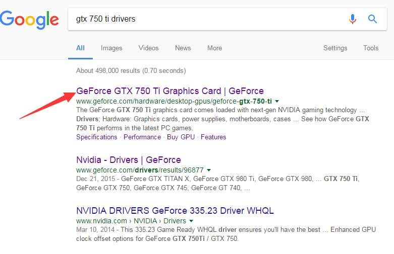 2. Введите «gtx 750 ti drivers» в поле поиска и нажмите Войти. Проверьте правильный результат в верхней части списка результатов. Обычно первый результат будет правильным. Нажмите на нее, и вы перейдете на страницу продукта.