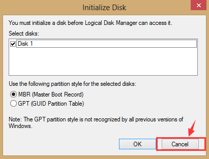 Если вы видите следующее уведомление, нажмите отменить, НИКОГДА инициализировать ваш диск.