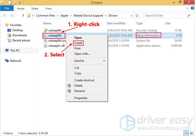 5) Во всплывающем окне щелкните правой кнопкой мыши usbaapl64.inf или же usbaapl.inf файл и выберите устанавливать.