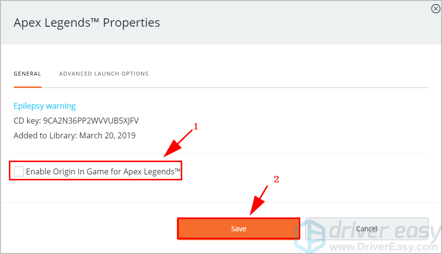3) Снимите флажок рядом с Включить Origin в игре для Apex Legends. Затем нажмите Сохранить.