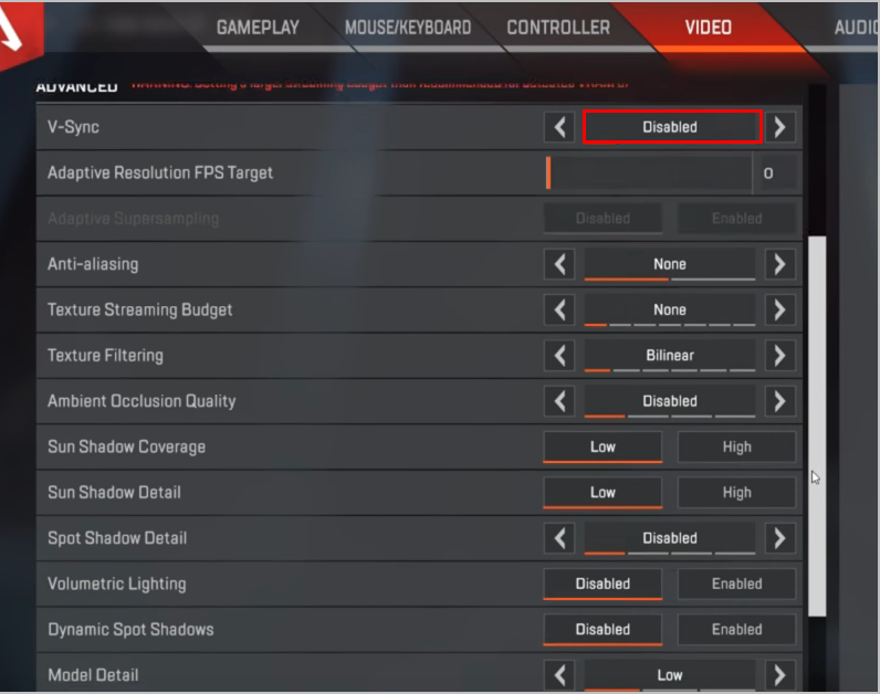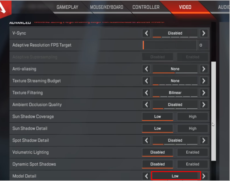 2. Установите для параметров видео Apex Legends значение Низкий