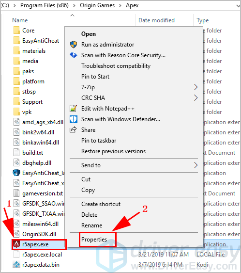 2) Щелкните правой кнопкой мыши на Apex Legends.exe и выберите свойства.