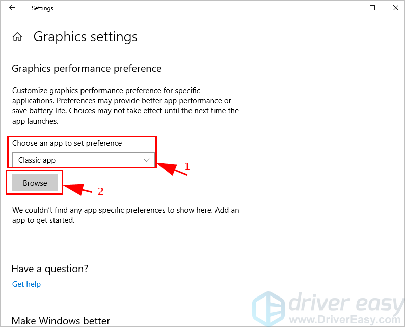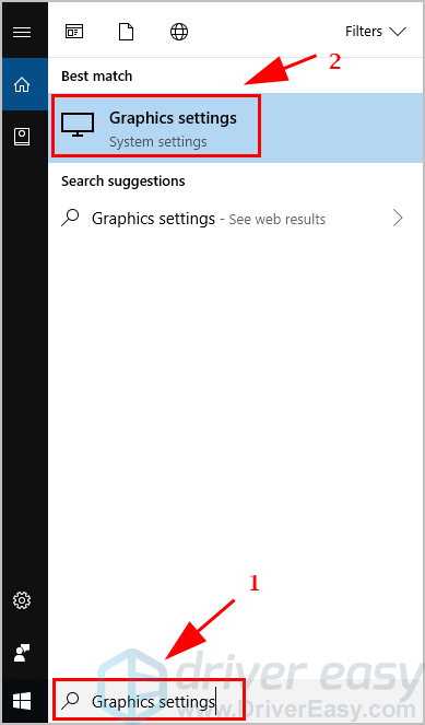 1) Тип Настройки графики в поле поиска на рабочем столе, затем нажмите Настройки графики.