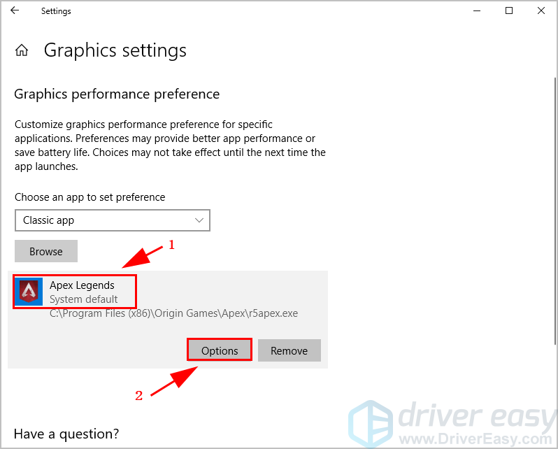 5) Приложение Apex Legends будет перечислено под Настройки графики. Нажмите на нее и нажмите Опции.