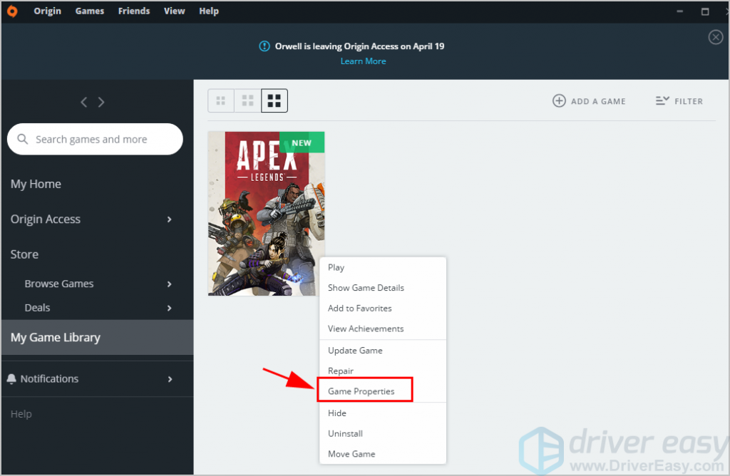 2) Щелкните правой кнопкой мыши на Apex Legends, и нажмите Свойства игры.