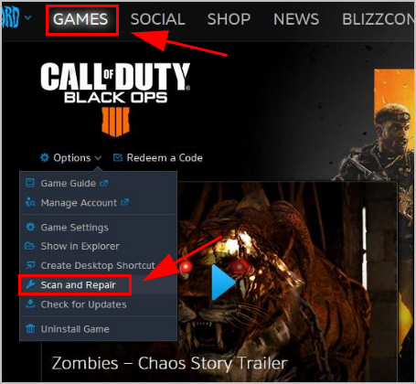 Функция сканирования и восстановления в приложении Blizzard помогает решить проблему сбоев Black Ops 4.
