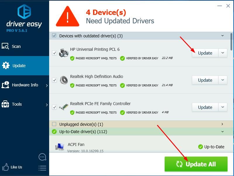 3) Нажмите Обновить Нажмите кнопку рядом с любым помеченным драйвером устройства, чтобы автоматически загрузить нужный драйвер, затем вы можете установить его вручную. (вы можете сделать это с СВОБОДНО версия).
