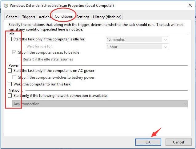 5) Снимите все пункты в условия раздел. Затем нажмите Хорошо.