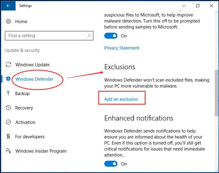 2) Нажмите Защитник Windows. Затем нажмите Добавить исключение в Исключения.
