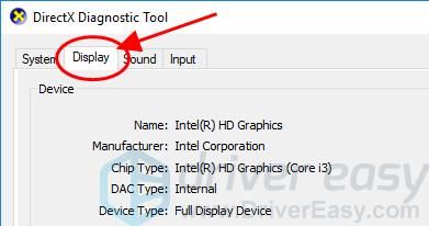 3) В DirectX Диагностический инструмент панель, нажмите дисплей Вкладка.