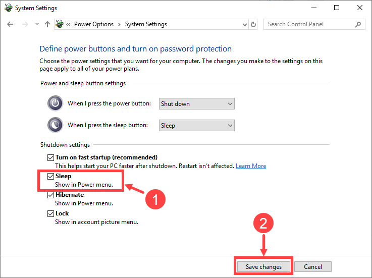 - Убедитесь, что вы проверите Спать коробка. Затем нажмите Сохранить изменения чтобы изменения вступили в силу.