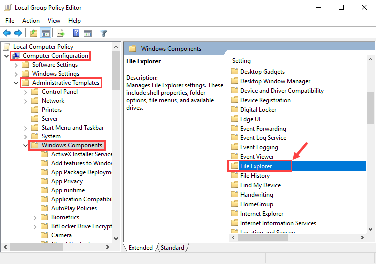 - Во всплывающем окне перейдите к Конфигурация компьютера -> Административные шаблоны -> Компоненты Windows -> Проводник.