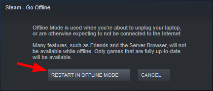 - Нажмите Перезапуск в автономном режиме, затем дождитесь перезагрузки клиента Steam.