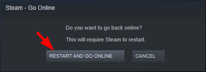 - Нажмите Перезапустить и перейти онлайн, затем дождитесь перезагрузки клиента Steam.