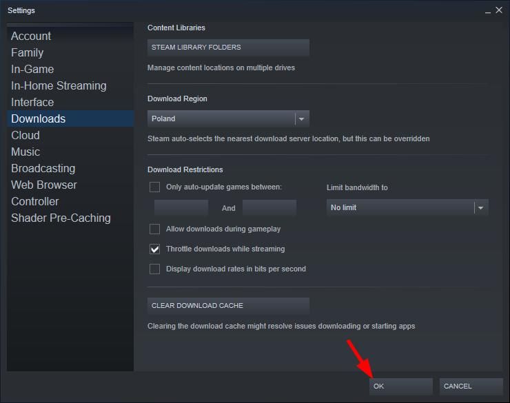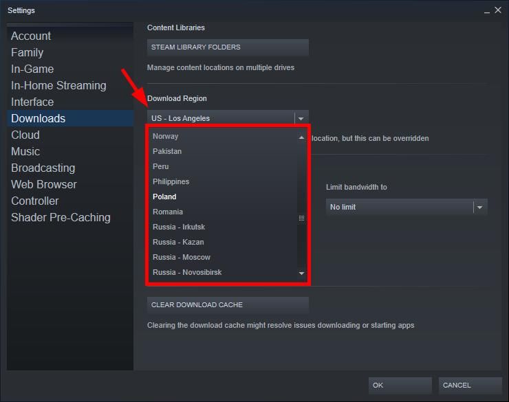 Затем проверьте, восстанавливает ли это вашу скорость загрузки в Steam. Если нет, возможно, вам придется попробовать другой регион загрузки.