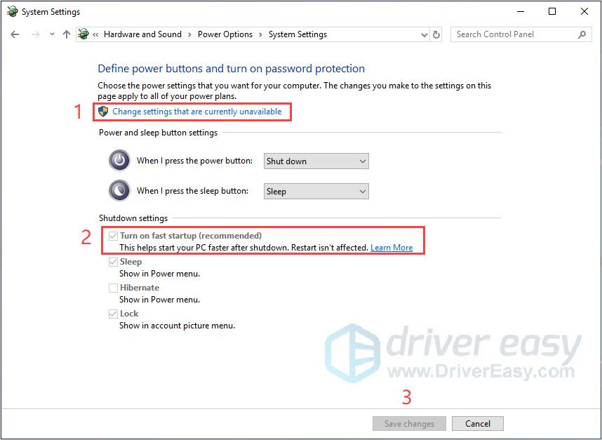 - Нажмите Изменить настройки, которые в данный момент недоступны. Тогда вы сможете снять галочку Включить быстрый запуск (рекомендуется). Нажмите Сохранить изменения.