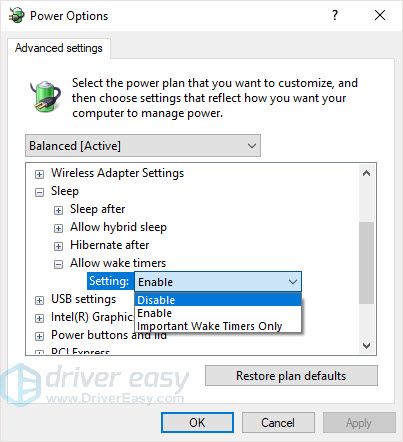 - Во всплывающем окне нажмите Спать > Разрешить таймеры пробуждения > запрещать. Затем нажмите Хорошо.