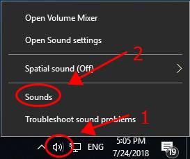 1) Щелкните правой кнопкой мыши на значок громкости в правом нижнем углу на рабочем столе и выберите Звуки.