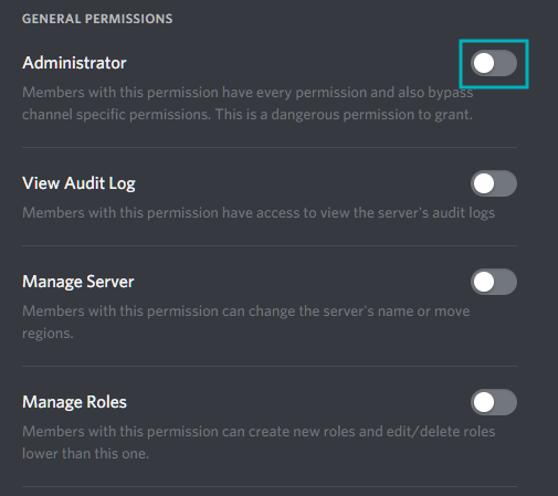 - Назовите роль как угодно, назначьте цвет для этой роли, чтобы отличать ее внешний вид от других, а затем перейдите к настройкам роли и общим разрешениям. После того, как роль была создана, вы можете назначить определенные серверные разрешения для этой роли, выключив или включив переключатели для каждого указанного разрешения. Самым первым параметром в разделе «Общие разрешения» должно быть разрешение администратора. Включите это, чтобы дать себе роль, близкую к идентичным.