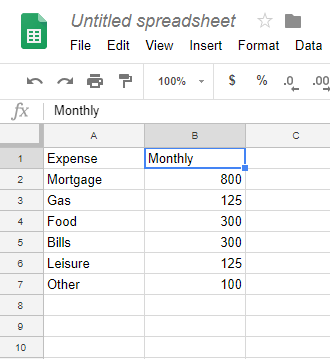 Работать с диаграммами относительно просто. Вам просто нужно иметь набор данных, на которые можно ссылаться, спроектировать диаграмму во встроенном инструменте построения диаграмм в Sheets, установить легенду, чтобы ее было легко понять, и вставить ее в электронную таблицу. Вы можете создать свои собственные данные, чтобы следовать этому руководству, или вы можете создать новый лист и использовать данные, которые я использую для своих примеров. В качестве примера диаграммы мы будем использовать простой небольшой лист со списком категорий расходов домохозяйства и ежемесячного бюджета для каждого расхода. Создайте лист с двумя заголовками «Расход» и «Ежемесячно» и добавьте на лист следующую информацию: