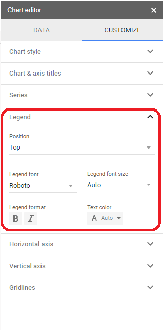 - Выберите вкладку «Настроить» в редакторе диаграмм, чтобы увидеть элементы управления форматированием. Поиграйте с ними, чтобы узнать, как изменить свой график. Диаграмма будет меняться по мере внесения изменений в диалоговом окне.