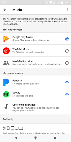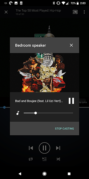 Нажмите на значок Cast, чтобы просмотреть список поддерживаемых устройств в вашей сети, включая Google Home, Home Mini или Home Max. Выберите громкоговоритель, к которому хотите подключиться, и вы услышите звон устройства после подключения. Как только вы начнете воспроизводить музыку из приложения Android, оно автоматически начнет воспроизведение на динамике Google Home в вашем доме. Если вы не уверены перед тем, как начать играть, подключены ли вы к своему устройству, проверьте значок Cast в приложении; он будет заполнен белым цветом, когда вы подключены. Если вы давно не играли музыку, возможно, ваш телефон или планшет отключен от динамика.