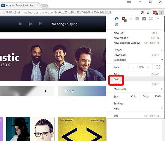 Как только вы откроете этот веб-плеер на своем компьютере в Chrome, нажмите или щелкните значок меню с тройными точками в правом верхнем углу браузера, чтобы открыть меню Chrome. Перемещайте курсор к нижней части меню, пока не найдете опцию «Cast …», и щелкните по ней. Важно, чтобы вы все еще были на вкладке с открытой музыкальной страницей Amazon, иначе это не будет работать.