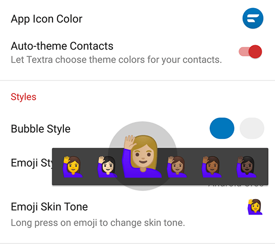 Textra также включает в себя возможность изменить тон кожи человеческих смайликов в вашей библиотеке. По умолчанию смайлики в Textra отображаются со стандартным желтым оттенком кожи, но, погрузившись в настройки, мы можем отредактировать Textra, чтобы показать другой оттенок кожи, соответствующий вашим предпочтениям. Вы можете изменить один из пяти различных уровней тона кожи (от бледно-белого тона до темно-коричневого тона кожи с несколькими вариантами между ними), или вы можете оставить этот параметр в желтом состоянии по умолчанию. Чтобы изменить параметр, вам нужно нажать и удерживать эмодзи внутри настроек, чтобы изменить свой тон.