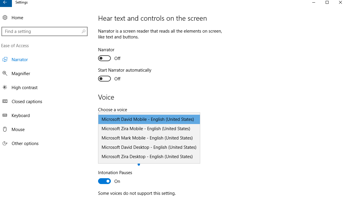 Переместившись немного ниже по параметрам настроек, вы увидите, что вы также можете изменить голос Диктора. Это в основном позволяет выбирать между более компьютеризированными голосами и голосами, которые звучат естественно. Вы можете использовать параметры «Скорость», «Высота тона» и «Интонация», чтобы поэкспериментировать со значениями того, как звучит голос, делая его наиболее естественным для вас.
