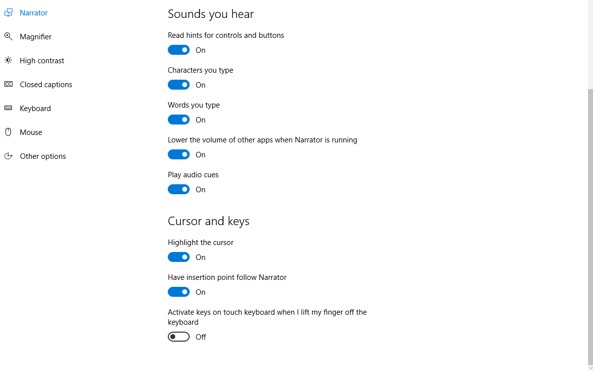 И, конечно же, в разделе «Звуки, которые вы слышите» вы можете выбрать, что именно зачитывает Рассказчик. В разделе «Курсор и клавиши» у вас есть некоторые другие основные настройки, такие как выделение курсора, указание точки вставки после повествователя и т. Д.