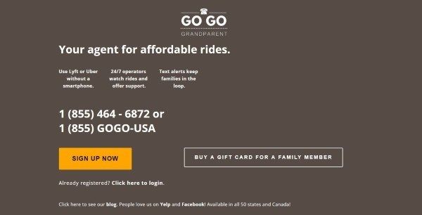 GoGoGrandparent использует людей в конце обычного телефона, чтобы выступать в качестве посредников. Вы звоните по их номеру и запрашиваете поездку, и они используют приложение Uber, чтобы это произошло. Они взимают плату, конечно, в настоящее время $ 0,27 за минуту. Это оплачивается за время разговора, а не за время в машине. Другие сборы идентичны Lyft, поэтому они не будут стоить вам дороже, чем использование приложения.